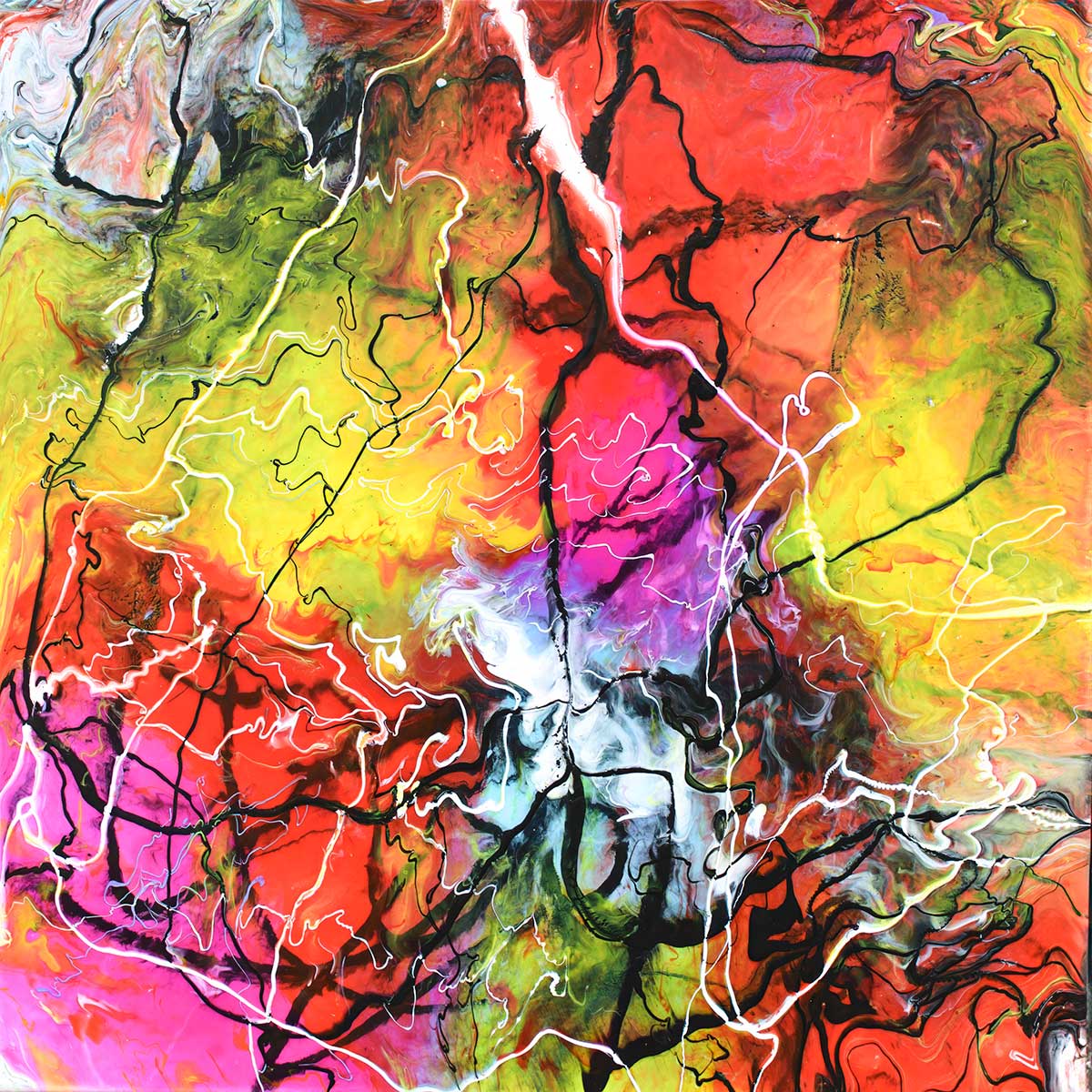 Maleri til stuen med en intens og organisk komposition, hvor varme røde og koralrøde felter breder sig ud mod limegrønne og gyldne områder i en flydende, næsten glødende bevægelse. Mørke sorte linjer og lyse hvide spor skærer gennem fladen og giver motivet retning. Helheden leder tankerne mod et levende, opløst landskab eller en strøm af energi fanget midt i udfoldelsen.
