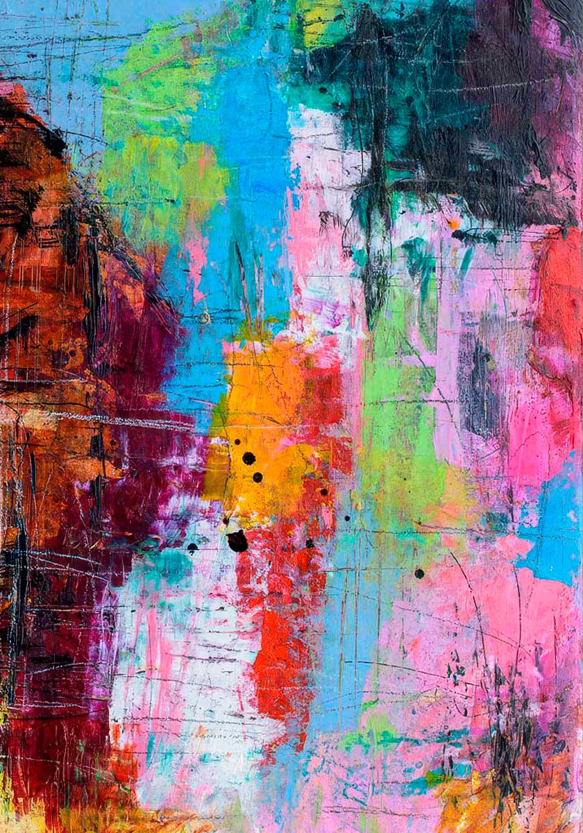 På væggen fungerer værket som et farverigt samlingspunkt med et lettere og mere åbent udtryk end de tungere kompositioner. Det egner sig godt i stue, entré eller arbejdsrum, hvor farverne kan løfte rummet, mens de grafiske linjer sørger for, at billedet bevarer styrke og visuel retning.