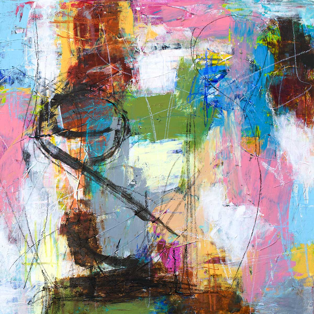 Flot lærredsprint med en åben og energifyldt komposition, hvor brede farvefelter, skæve linjer og mørke konturer skaber en levende billedflade. Lyse blå toner, støvet rosa, varm okker og frisk limegrøn står side om side med dybere brune og sorte markeringer. Formen leder tankerne mod figurer, bevægelse og abstrakte fragmenter af et moderne byrum.
