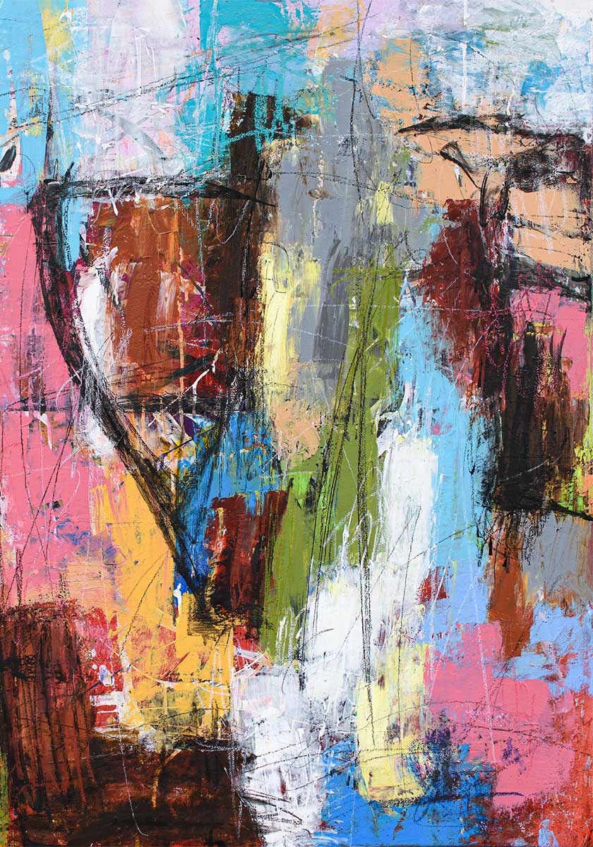Lag-på-lag teknikken giver motivet en tydelig dybde, hvor flere farvelag arbejder sammen i en kompleks struktur. Nogle områder fremstår næsten transparente, mens andre partier er mere tætte og mættede i farven. Kombinationen giver billedet en dynamisk rytme.