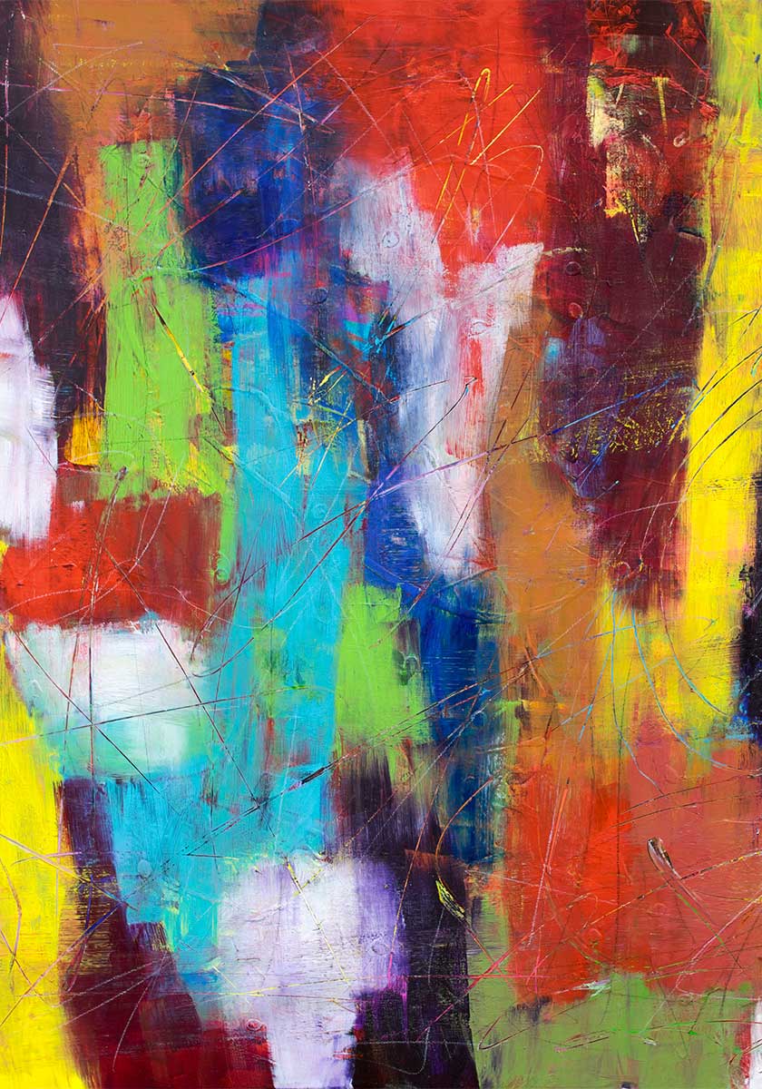 Lærredsbillede farverigt med en energisk og ekspressiv komposition, hvor varme farver møder kølige toner i brede og dynamiske penselstrøg. Motivet bevæger sig gennem stærke nuancer af rød, orange og gul, som brydes af turkis, blå og grønne partier. De lodrette og diagonale spor giver billedet en rytme, der kan minde om abstrakte landskaber eller fragmenter af lys og skygge.