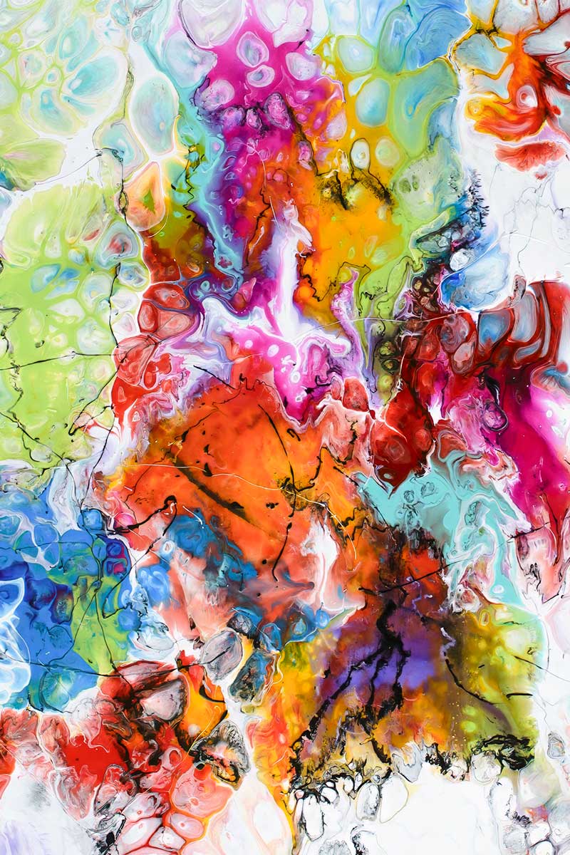 Pouring teknikken skaber de karakteristiske cellestrukturer og flydende former, hvor farverne presser sig ind over hinanden og danner naturlige overgange. Tynde sorte linjer løber gennem motivet og samler energien, så helheden ikke bliver tilfældig, men balanceret. Nogle områder fremstår tætte og intense, mens andre er lysere og mere luftige, hvilket giver en tydelig rytme i billedet.