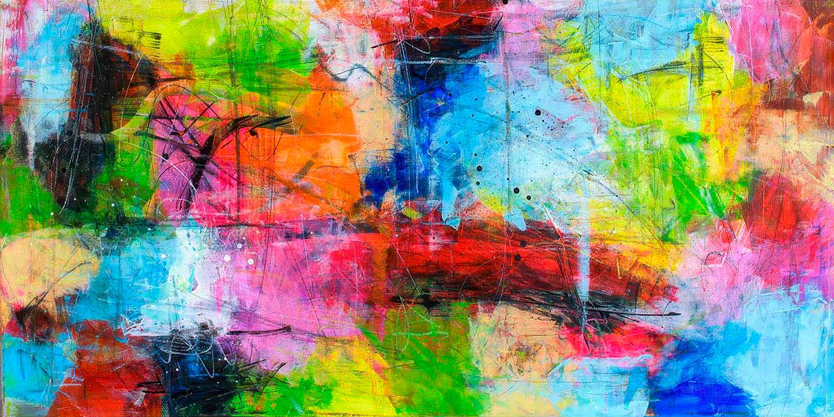 På væggen fungerer værket som et opløftende og farvestærkt kunstværk, der kan samle en stue eller et større opholdsrum. Det brede format gør det særligt velegnet over sofa eller spisebord, hvor farverne kan brede sig og tilføre rummet lys, energi og en tydelig kunstnerisk tilstedeværelse.