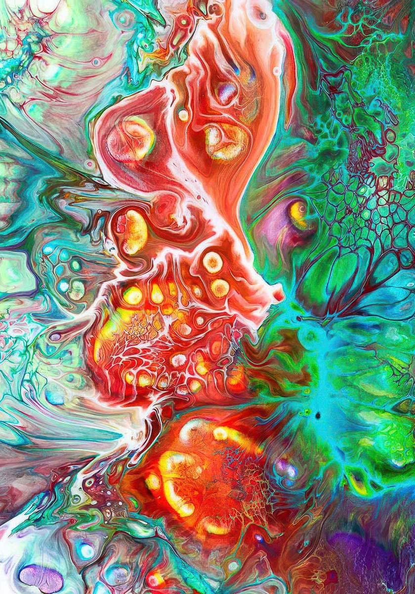 Lærredsbillede med farver hvor en kraftig og organisk komposition samler glødende rødorange former, mintgrønne og turkise partier samt dybe violette skygger i et tæt, levende motiv. De mange cellelignende mønstre og bløde strømme leder tankerne mod noget biologisk, marint eller næsten glødende indefra, som om billedet rummer sit eget lys.