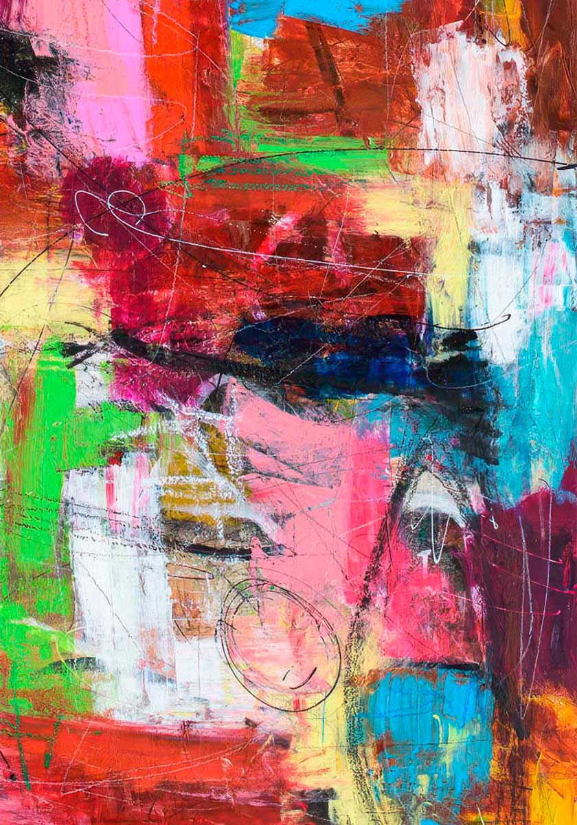 Lærredsprint røde farver med en varm og tæt komposition, hvor pink, karminrød, turkis, limegrøn og hvide felter samles i et markant farveforløb. Sorte og hvide linjeforløb skærer gennem fladen og giver motivet struktur mellem de blødere lag. Helheden leder tankerne mod et abstrakt rum fyldt med bevægelse, varme og en tydelig spænding mellem det organiske og det grafiske.