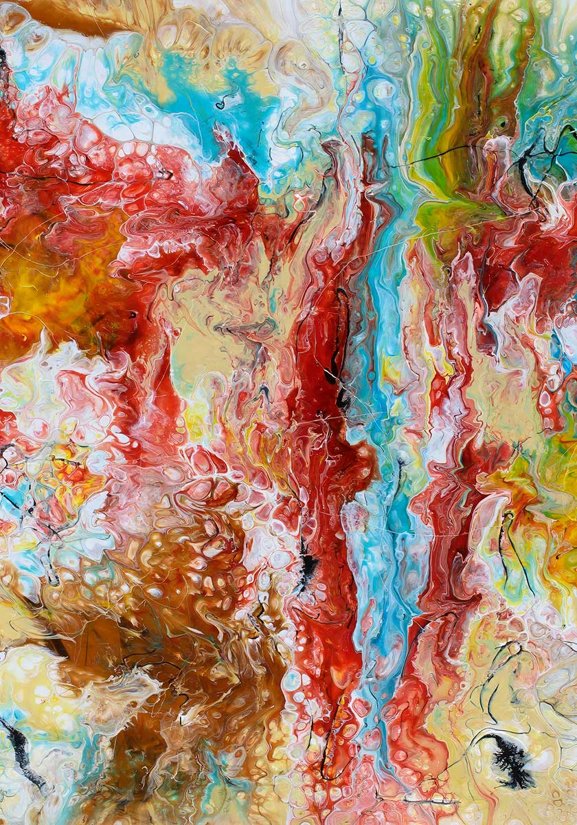 Motivet er baseret på et originalt maleri udført i pouring teknik, hvor farverne er styret i flydende lag for at skabe både lodret bevægelse og organiske overgange. Ved gengivelsen på lærred er der lagt vægt på at fastholde det fine spil mellem de varme koraltoner, de lyse aqua partier og de små cellemønstre.