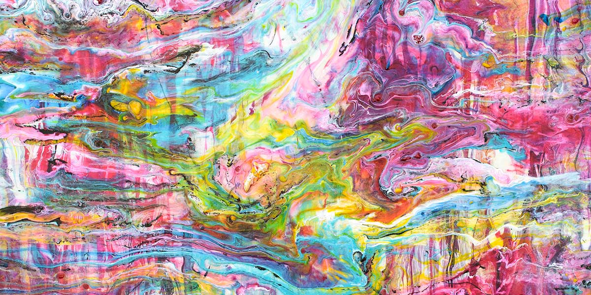Pouring teknikken ses tydeligt i de mange glidende farvesammenløb, de marmoragtige slør og de steder, hvor farverne trækker sig ud i tynde lag. Nogle partier virker næsten tågede, mens andre står mere mættede og koncentrerede. Den variation giver billedet dybde og gør, at det ændrer karakter alt efter afstand, lys og hvordan øjet bevæger sig langs den brede komposition.