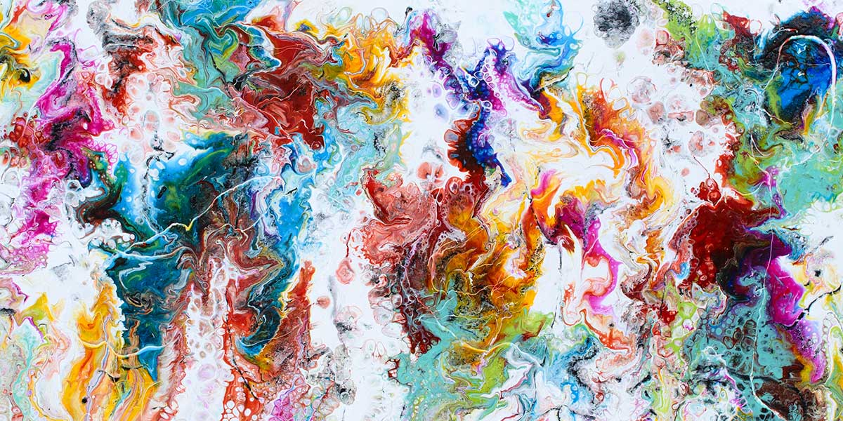 Stort lærredsbillede abstrakt med et eksplosivt og bevægeligt udtryk, hvor farverne rejser sig i lodrette strømme hen over en lys bund. Kompositionen opleves som flere energifelter, der mødes og flettes ind i hinanden – uden at miste deres egen karakter. Formatet understreger bevægelsen på tværs og giver motivet en stærk panoramisk effekt.