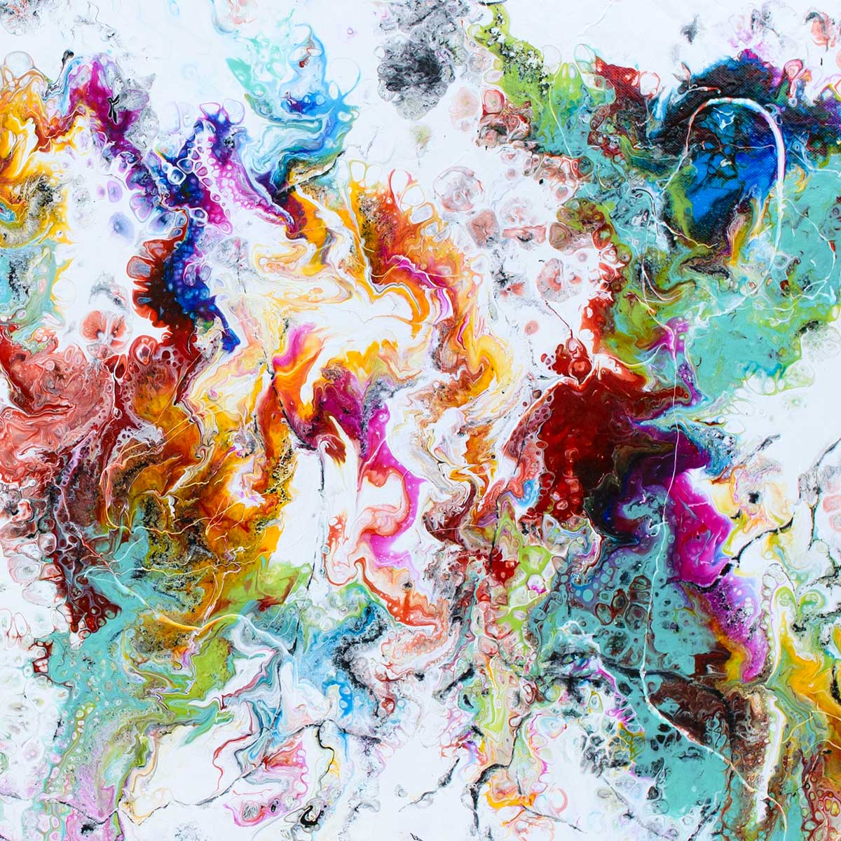 Motivet udspringer af et originalt maleri skabt i pouring teknik, hvor farverne får lov at flyde og samle sig i både åbne og tættere partier. Ved overførslen til plakatformat er der lagt særlig vægt på at bevare spændet mellem de lyse hvide områder og de mere intense farvezoner. Det er netop den kontrast, som bærer værkets energi og åbenhed.
