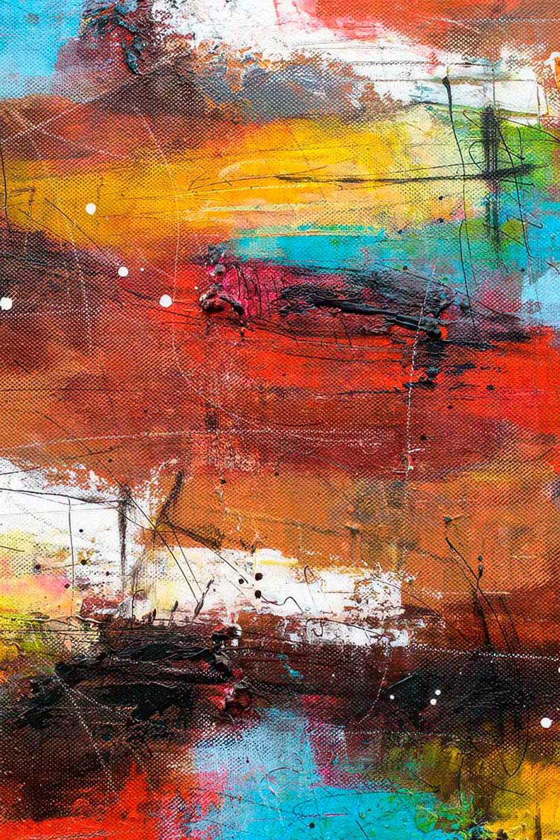 Abstrakt lærredsbillede med kunst i panoramaformat, hvor varme røde og orange toner kombineres med turkis, grøn og lyse partier. Kompositionen har en tydelig horisontal opbygning, som giver billedet ro og struktur, mens farverne tilfører energi og bevægelse.