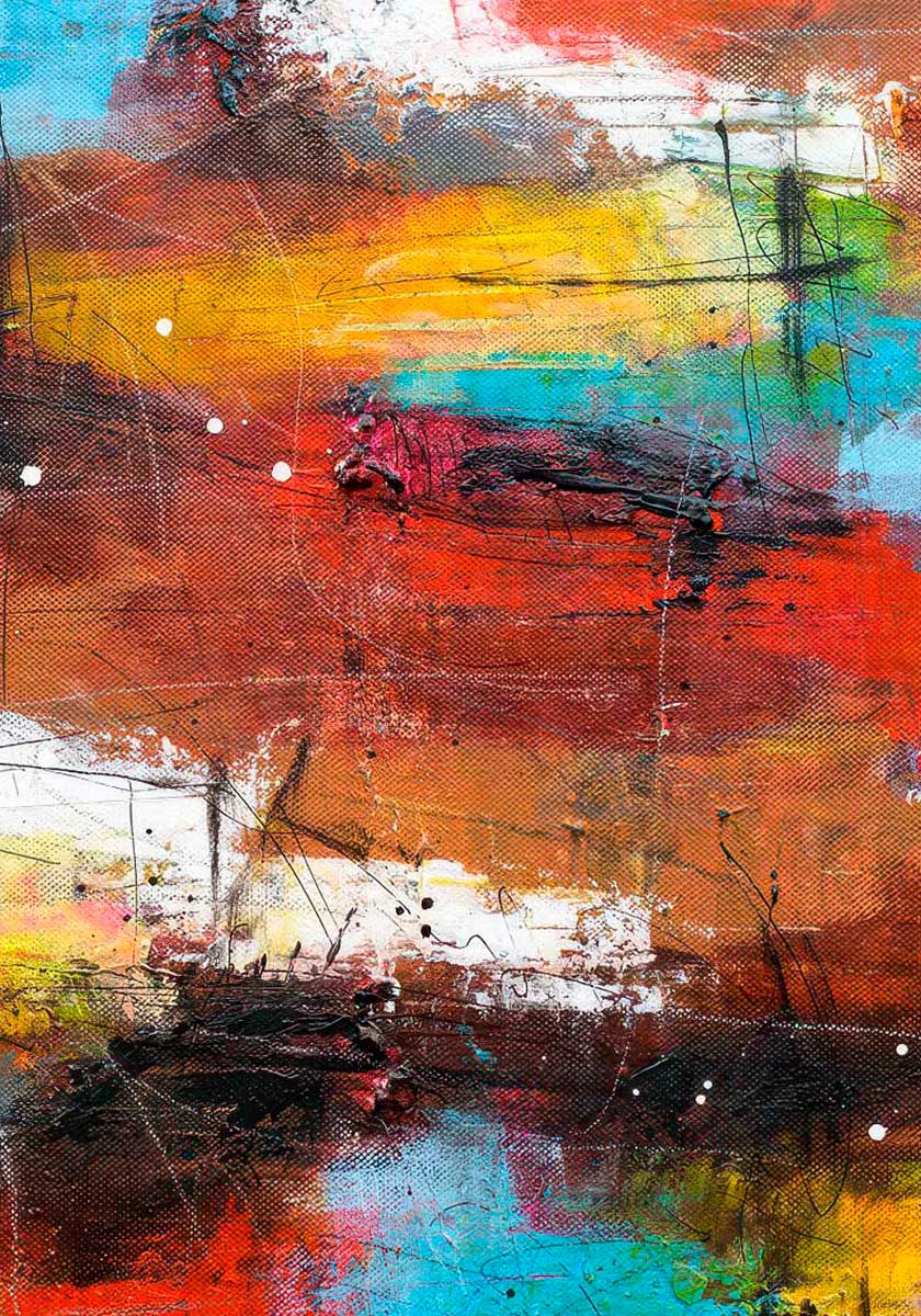 Plakat i varme farver med et energisk, men afbalanceret udtryk, hvor lag på lag-opbygningen giver motivet dybde og variation. Fladen er struktureret i brede felter, som skaber en rolig bevægelse på tværs af billedet.